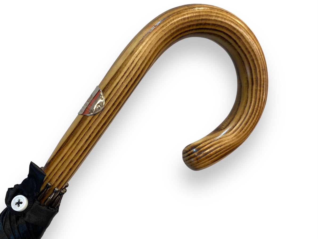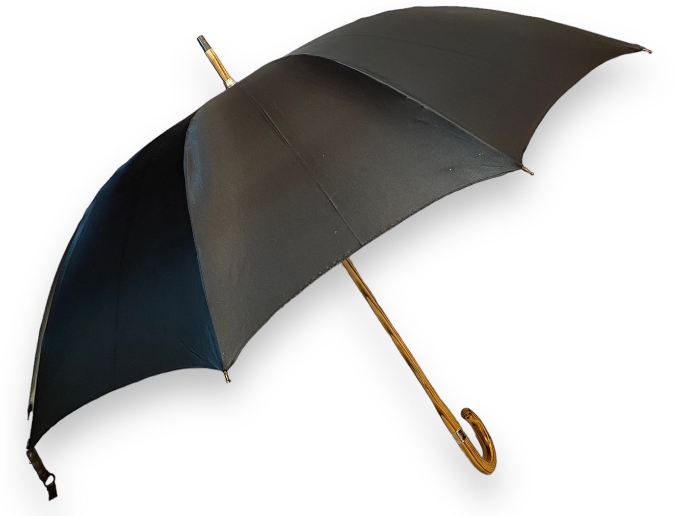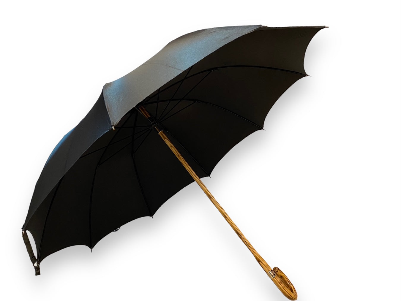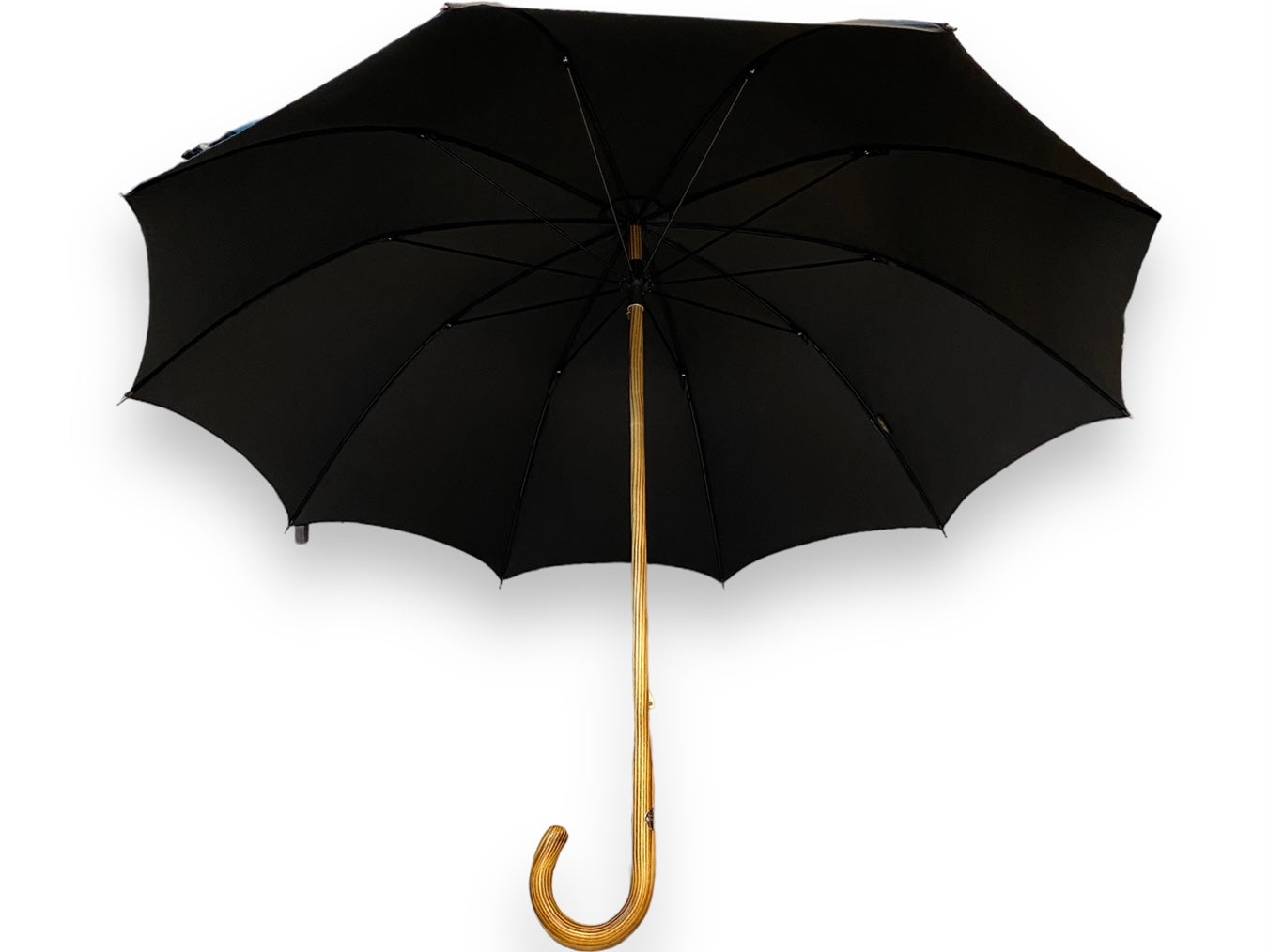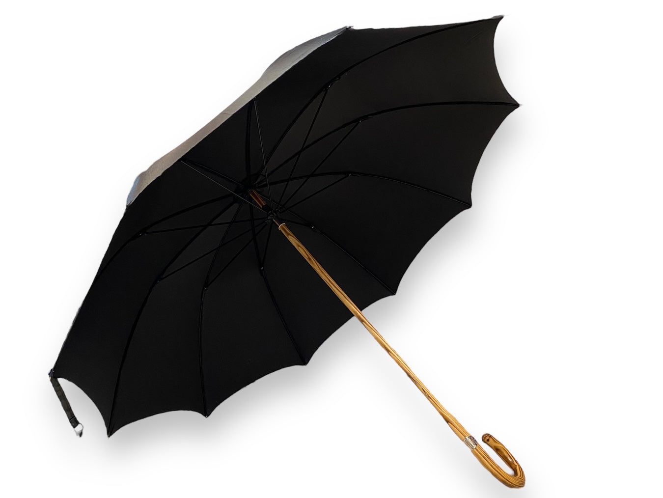 Blonder Hickory-Regenschirm, glänzender schwarzer Stoff, 10 Rippen, handgefertigte Domizio-Regenschirme seit 1989
