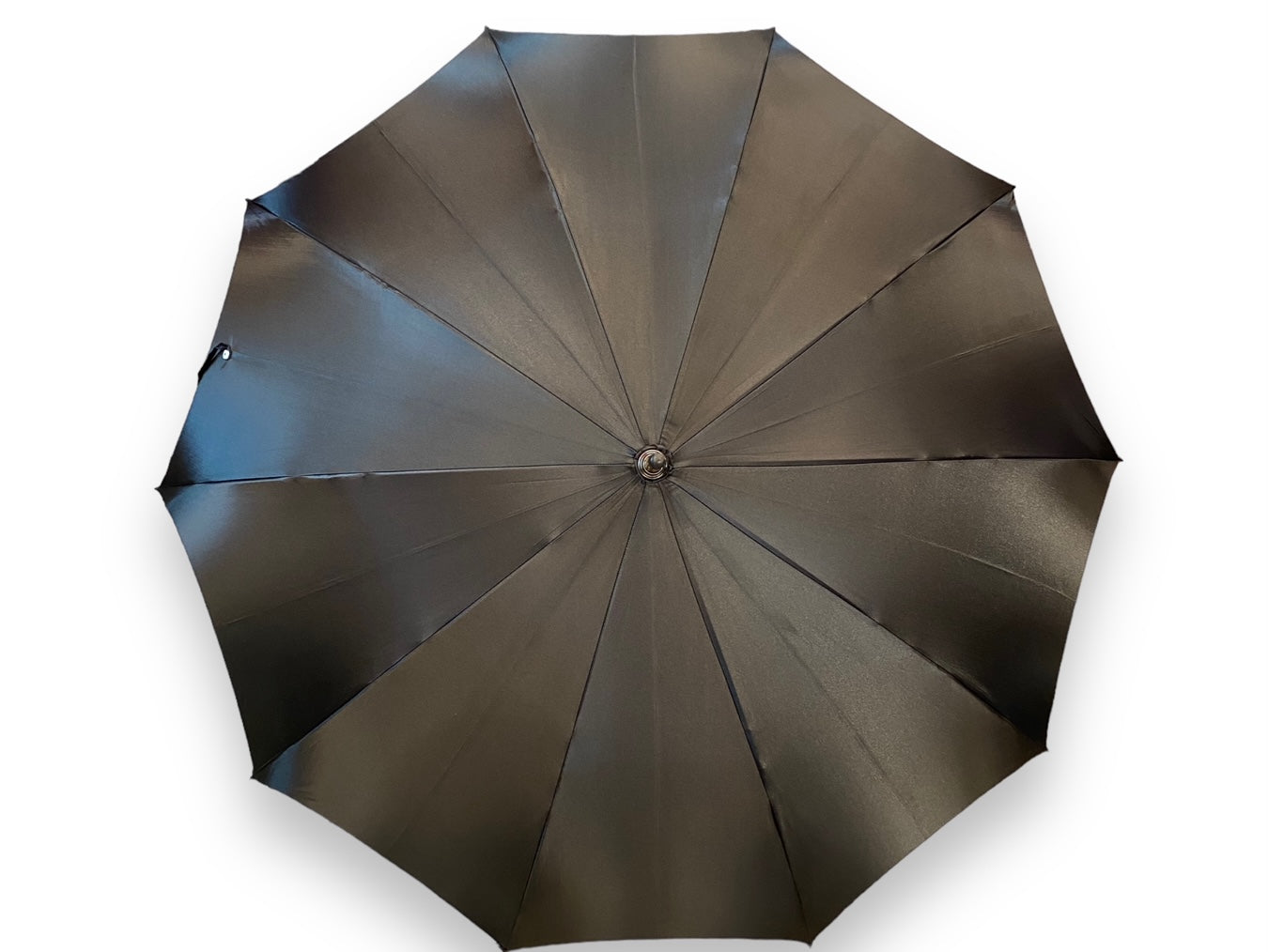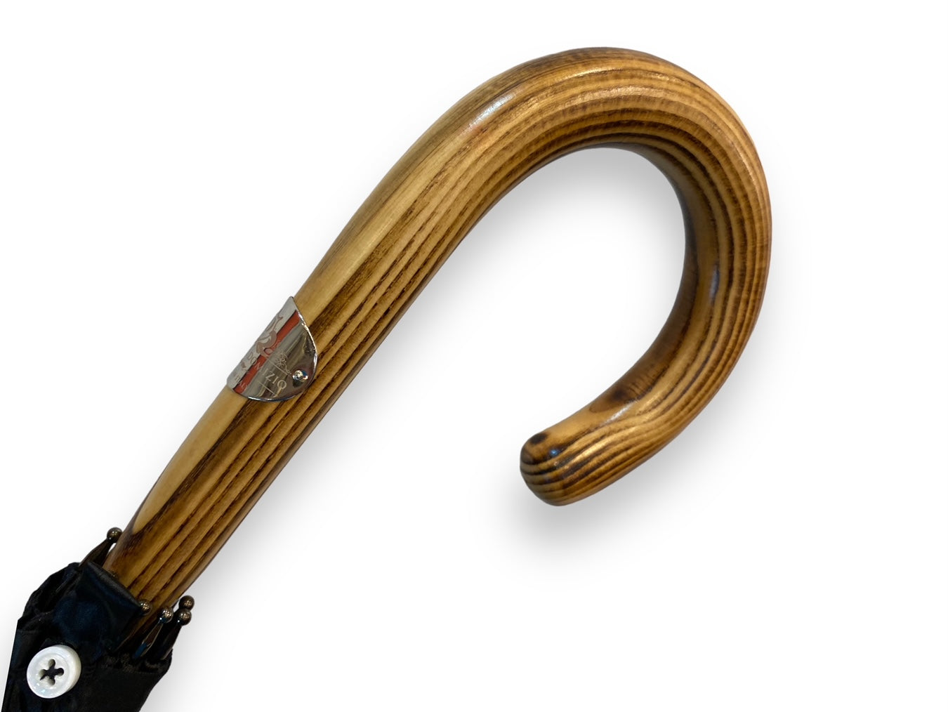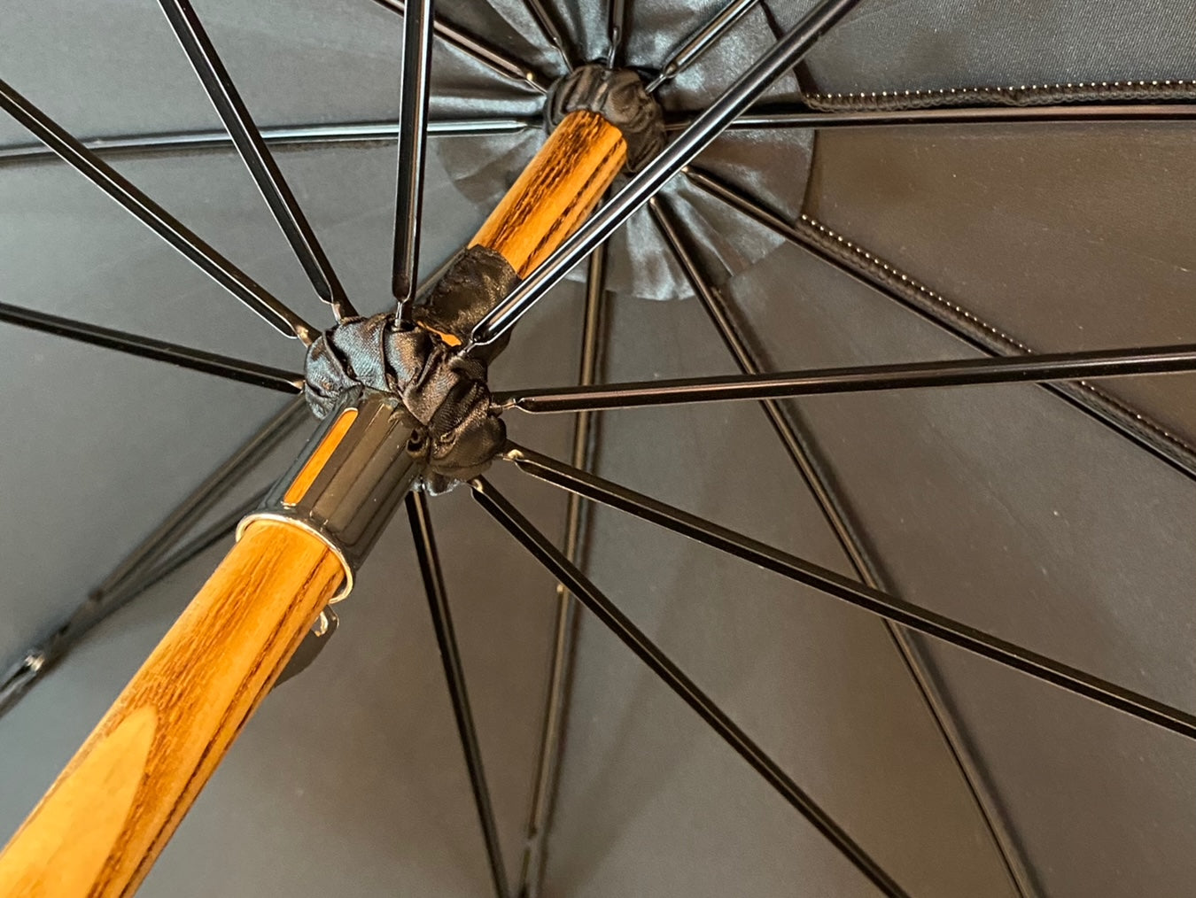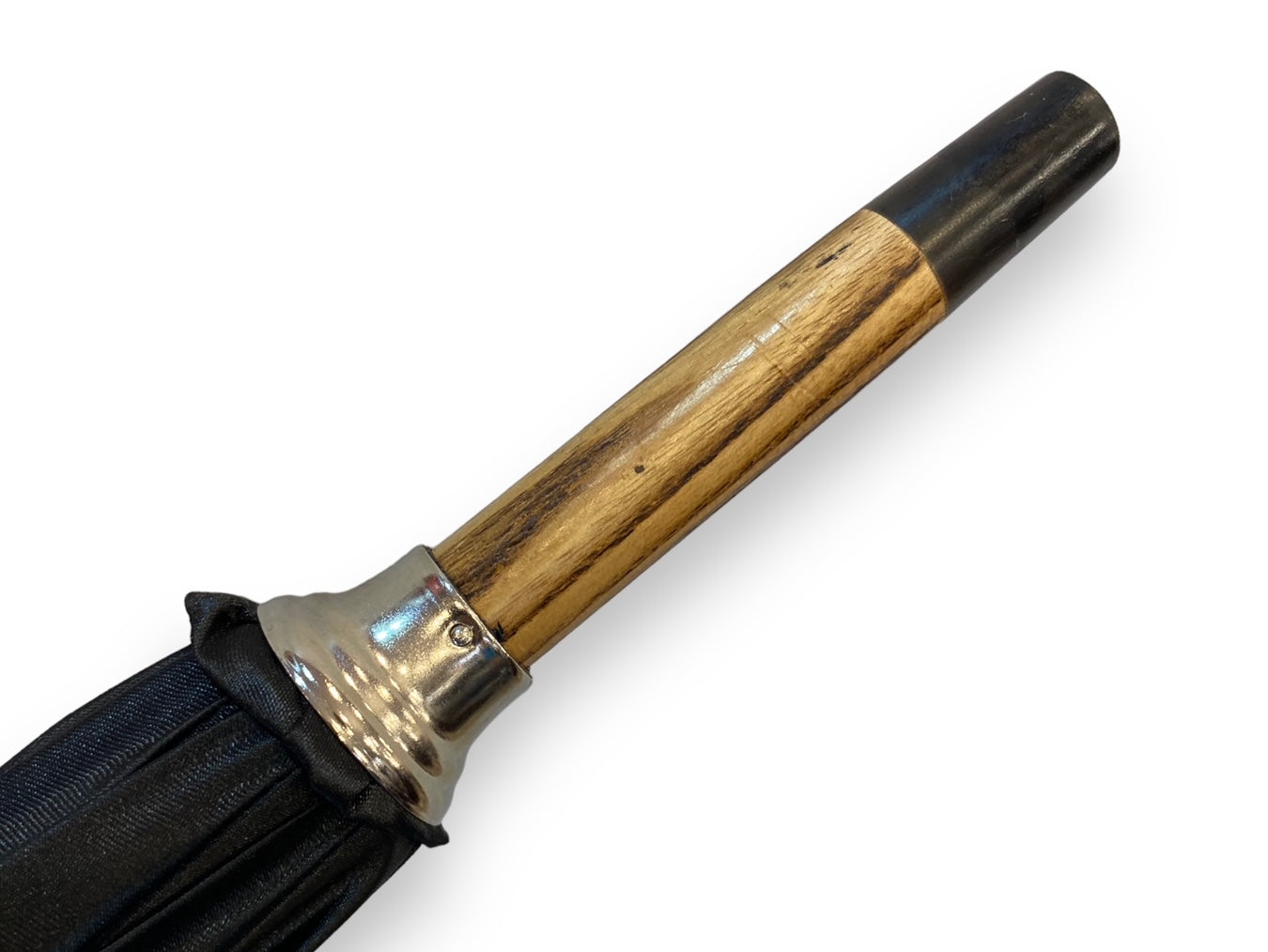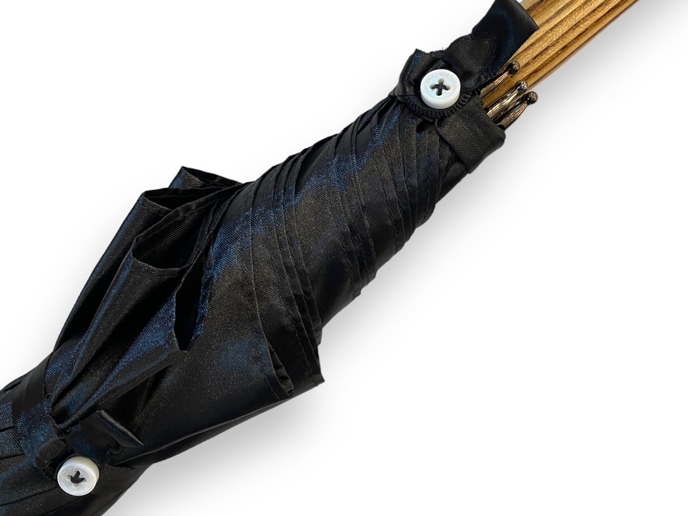 Blonder Hickory-Regenschirm, glänzender schwarzer Stoff, 10 Rippen, handgefertigte Domizio-Regenschirme seit 1989