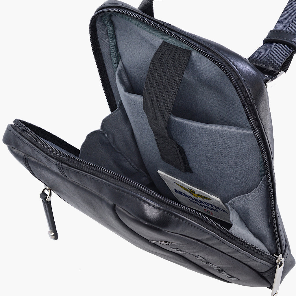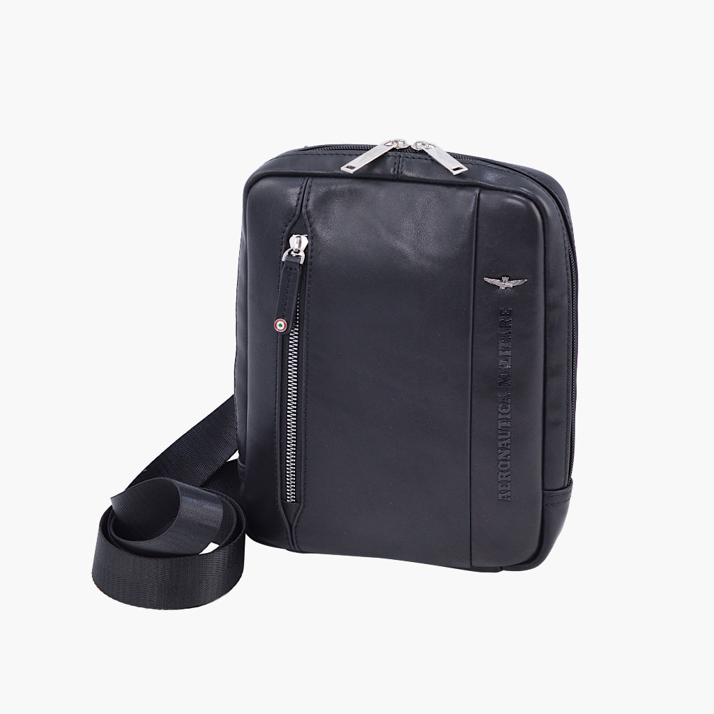 Mittelgroßer Schultergurt aus echtem Leder mit internem Organizer und Tablet-Fach. Das Produkt zeichnet sich durch seine minimalistische Linie aus, die mit einem glänzenden vertikal platzierten Aeronautica Militare- Logo verziert ist.